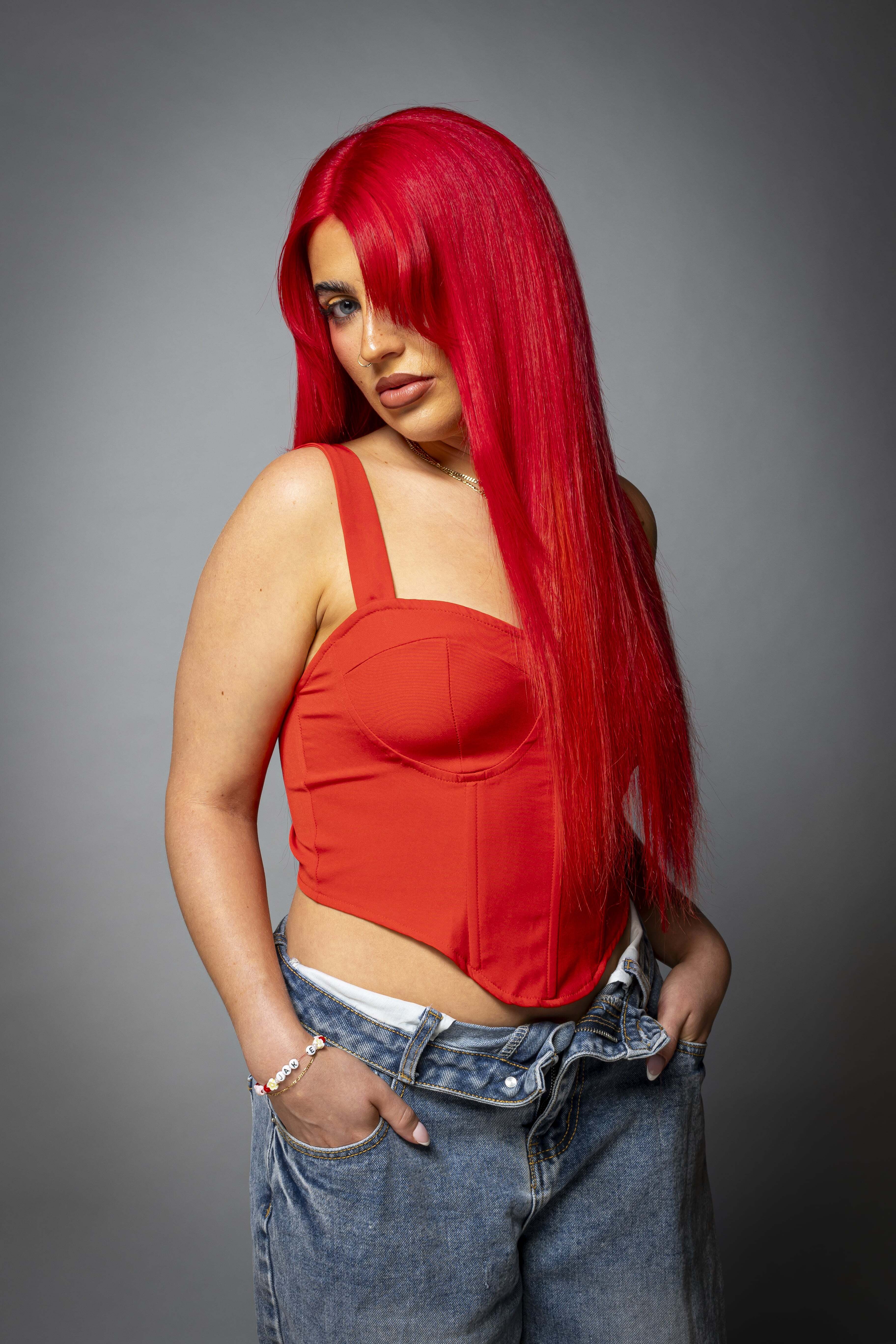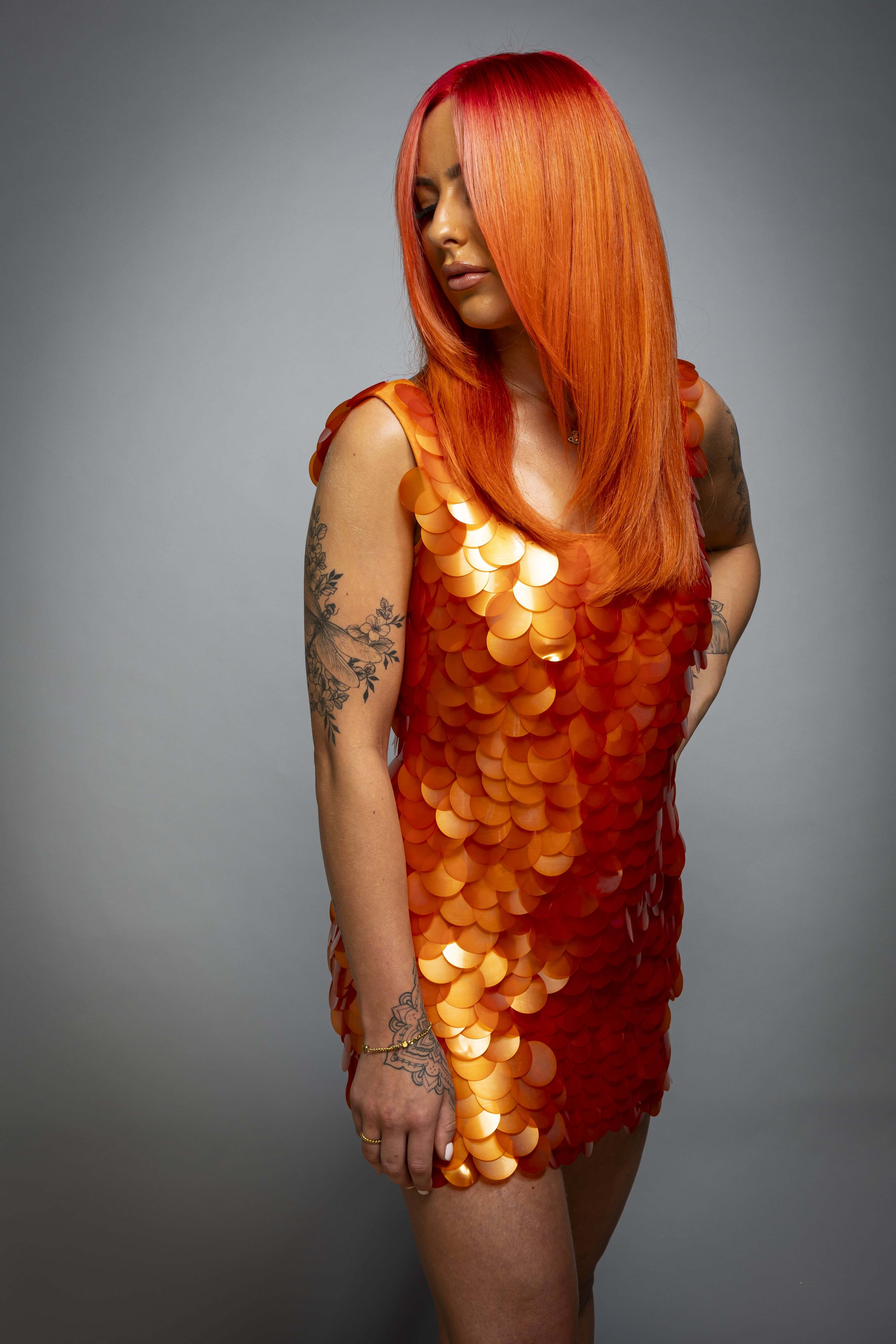 Using Neon Red as the base, with touches of Poppy Red, Carnation Pink and Peach throughout, Paco created a showpiece as iconic as our model Jenna.