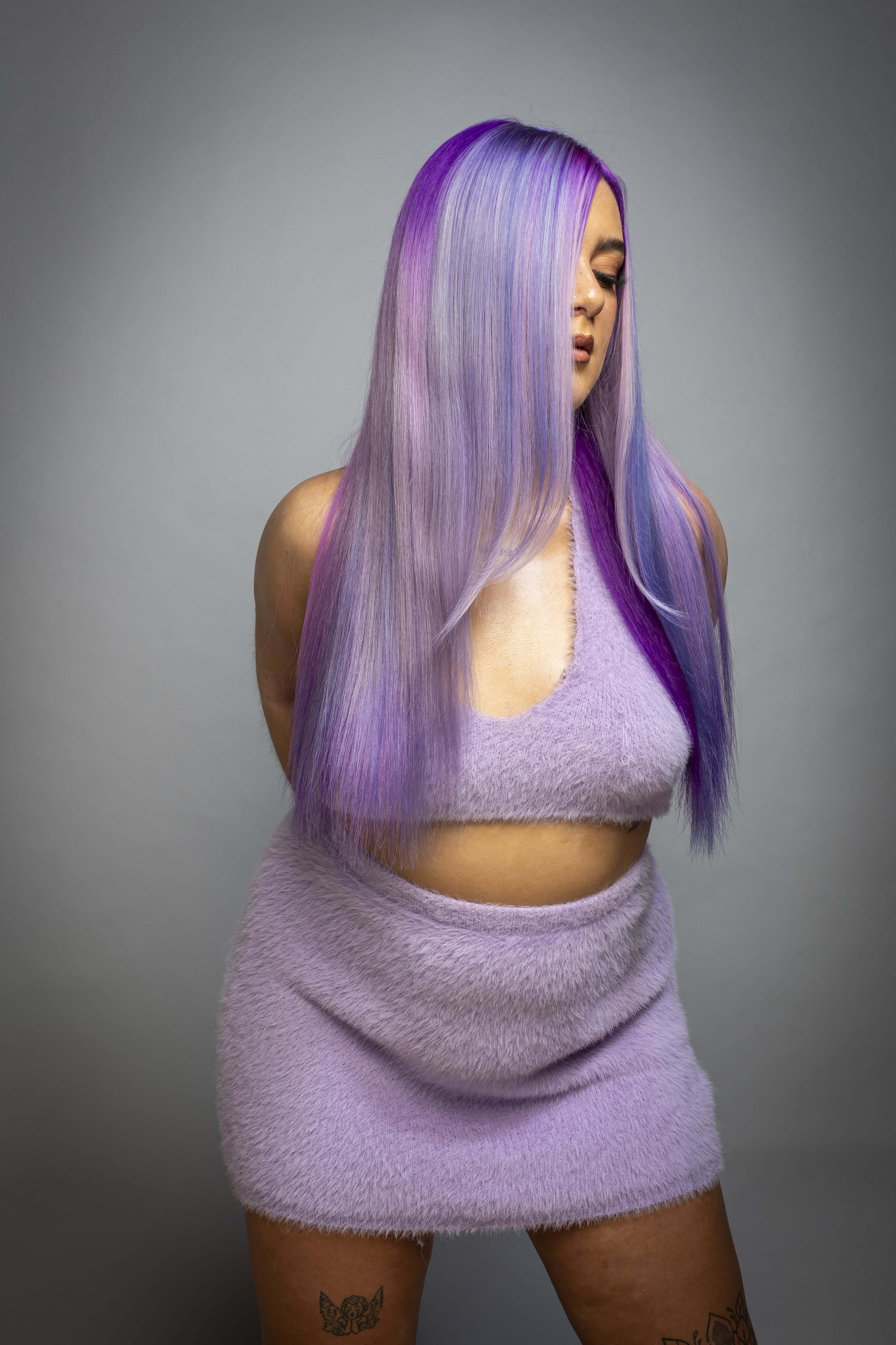Created using an equal mix of Neon Blue and Cerise – with hints of Lilac, Lavender, Wisteria and Antique Mauve sprinkled throughout – Amy’s ‘Willow Violet’ look is a dreamy masterpiece we absolutely adore.