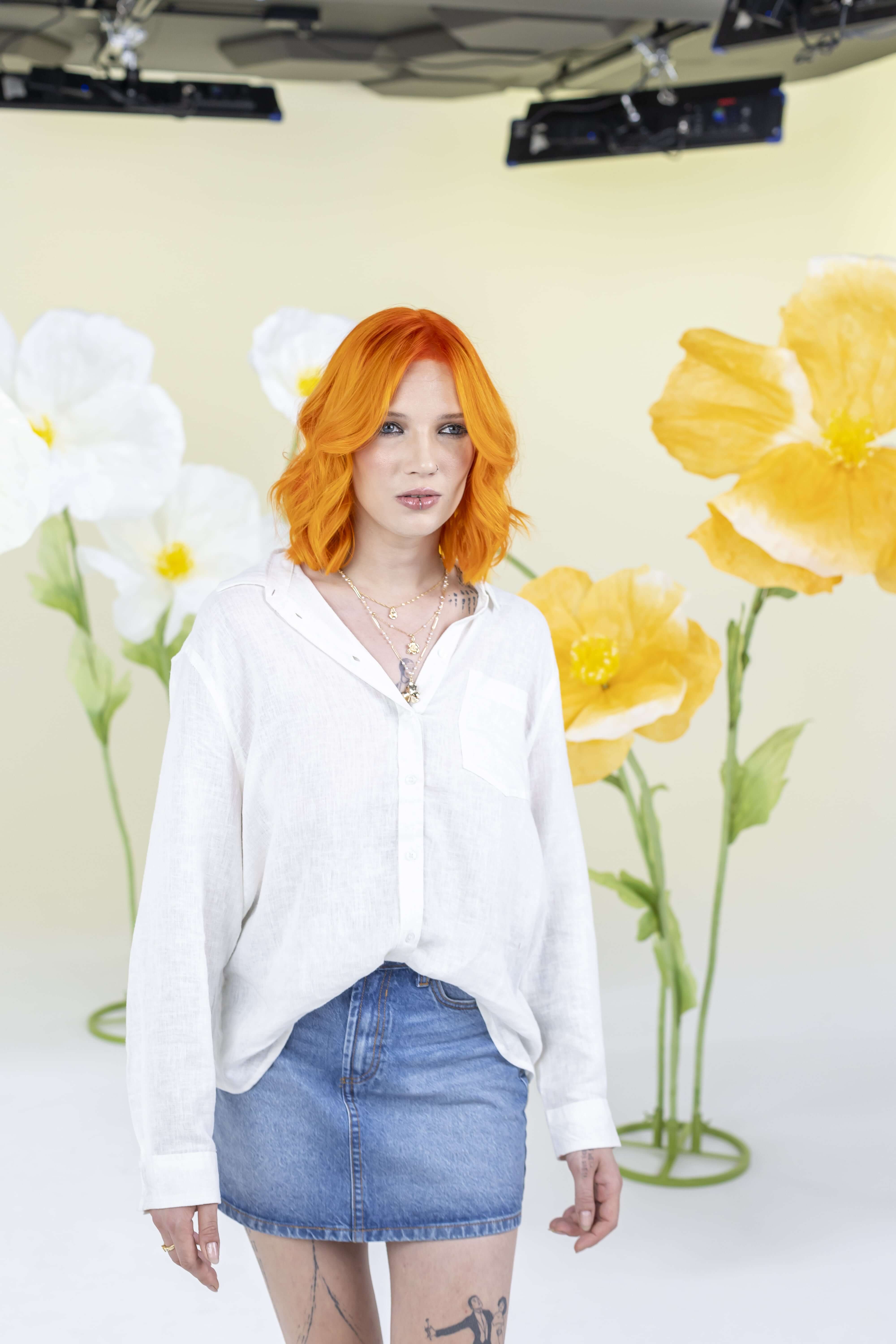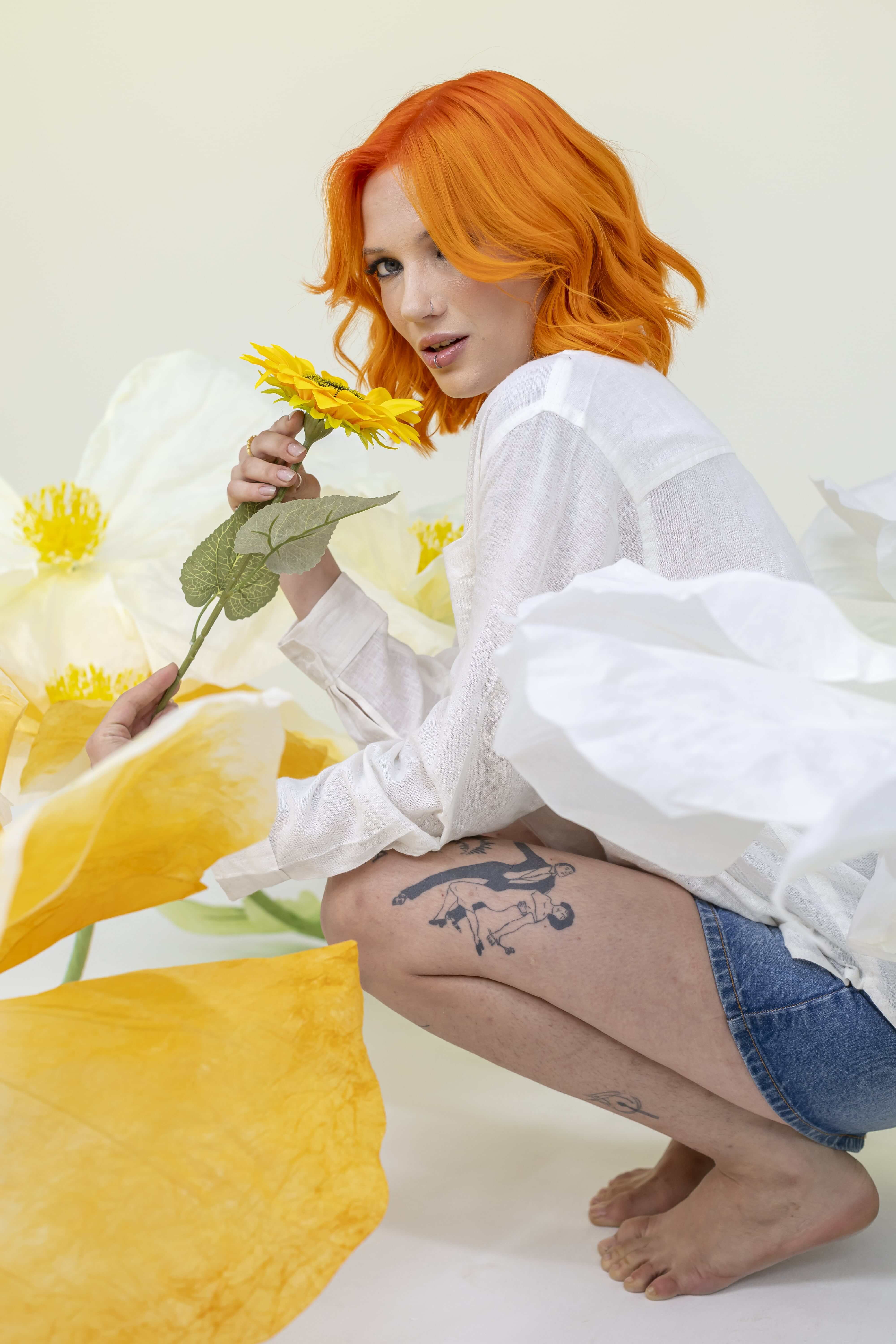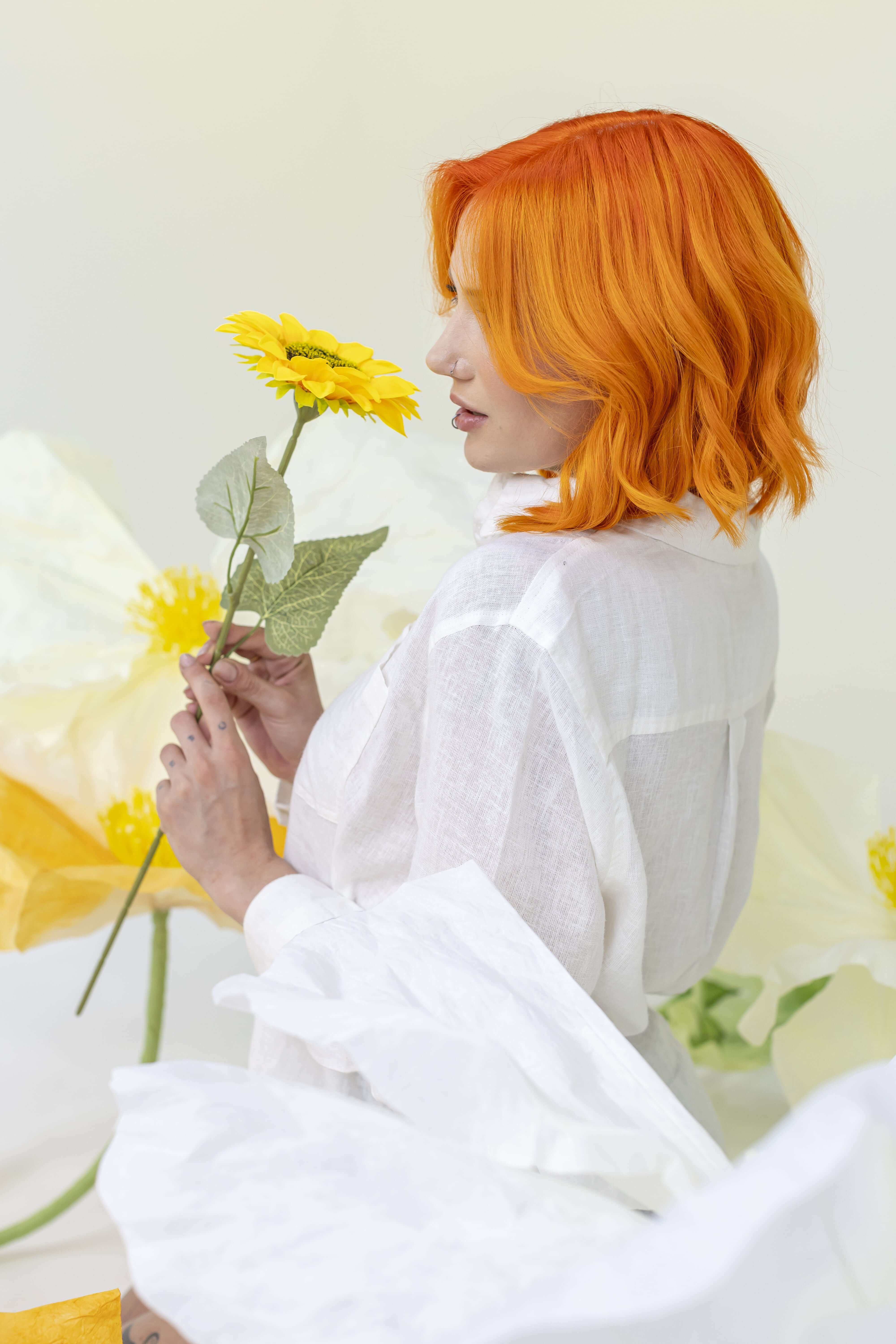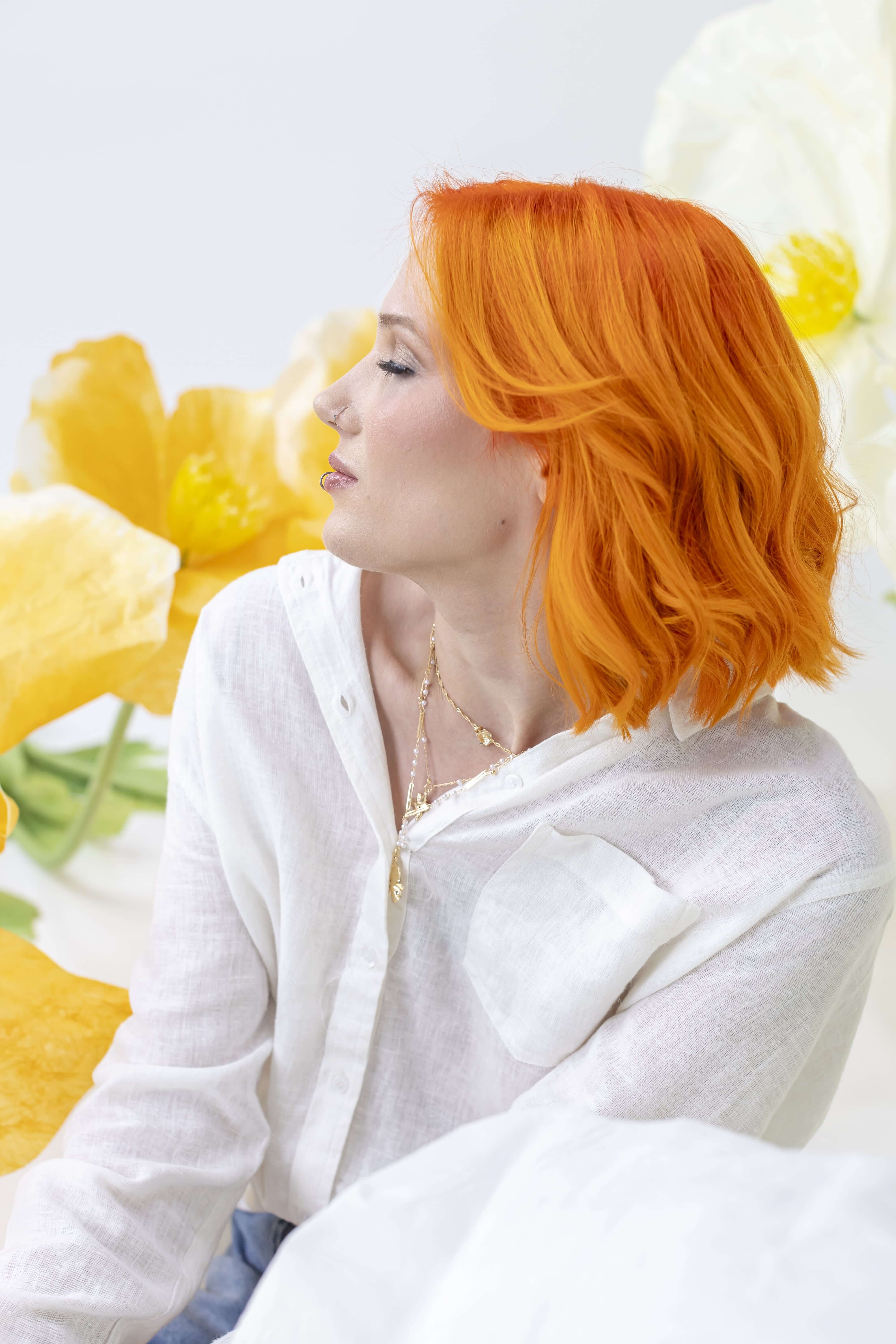 Working off a base of Sunflower from the Summer Yellow Edit, Amy applied our fiery Tangerine tone at the roots of Maja’s hair. That infused her locks with deeper, sunset-orange tones that complemented the previous bright yellow hues.