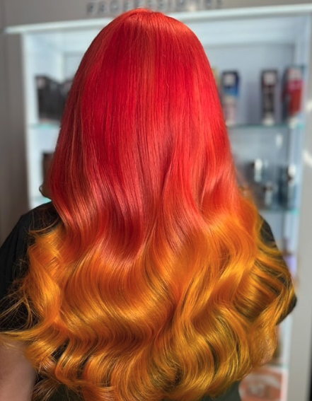 Starting with Poppy Red at the roots before flowing into Peach at the tips, this seamlessly blended look is sure to steal the spotlight at any festival or summer party you attend.