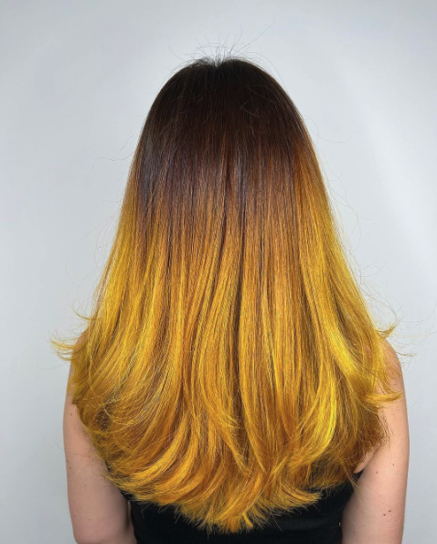 With Bright Daffodil ends shining against the dark natural roots in a smooth, rich balayage effect, this modern take on ombré feels both grounded and glowing, like late summer sunshine.