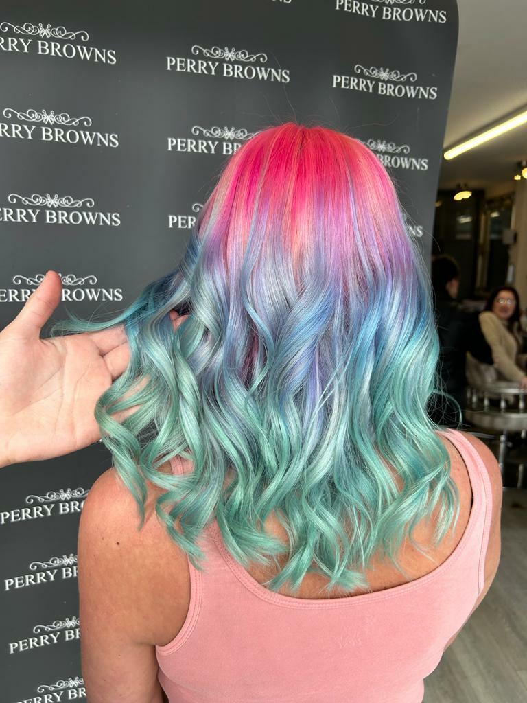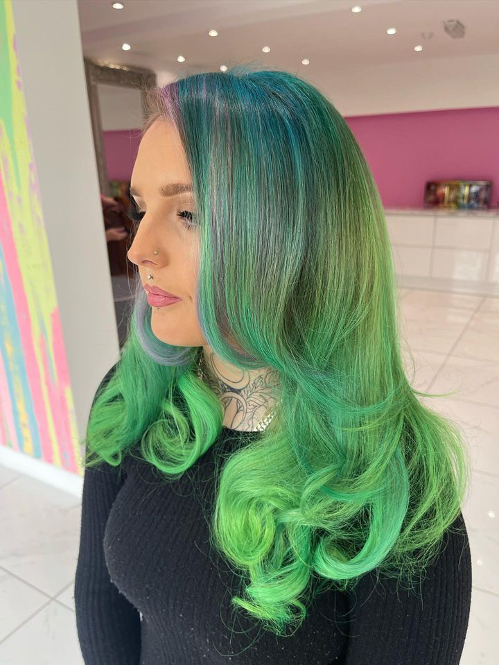 Once you have the art of blending down, then take a leaf out of our stylist's book. Using Turquoise at the roots, then melting into a mix of Spring Green with Fluorescent Green. Make sure to make the mix before applying! If that is still not enough colour, then add a touch of Lavender using a face-frame placement like our stylist.