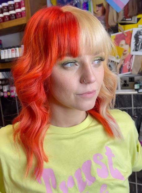 If you're feeling inspired by our most juicy range, then get mixing like our stylist below! Using a blend of Tangerine and Flame, we hope you're just as obsessed with this result as we are. Then, with a chunky blonde panel made with our awesome hair lightening range, this look is given a modern twist.